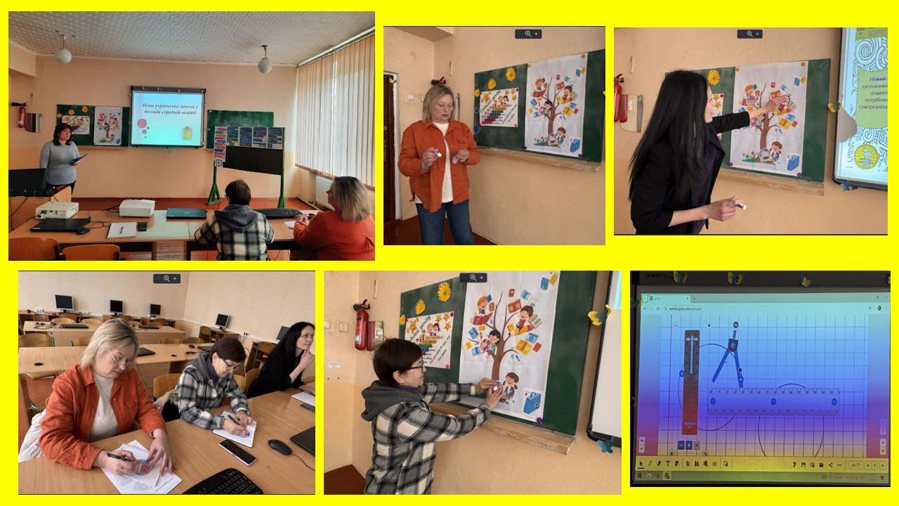 На засіданні професійної спільноти вчителів природничо-математичного циклу вчителі розглянули реалізацію принципів та ідей НУШ у базовій середній освіті, презентували потенціал інтерактивної дошки Gynzy для сучасного навчання, обмінялись інструментами та методами для оцінювання груп результатів у НУШ, обговорили вибір підручників з природничо-математичних дисциплін для 8 класу НУШ.