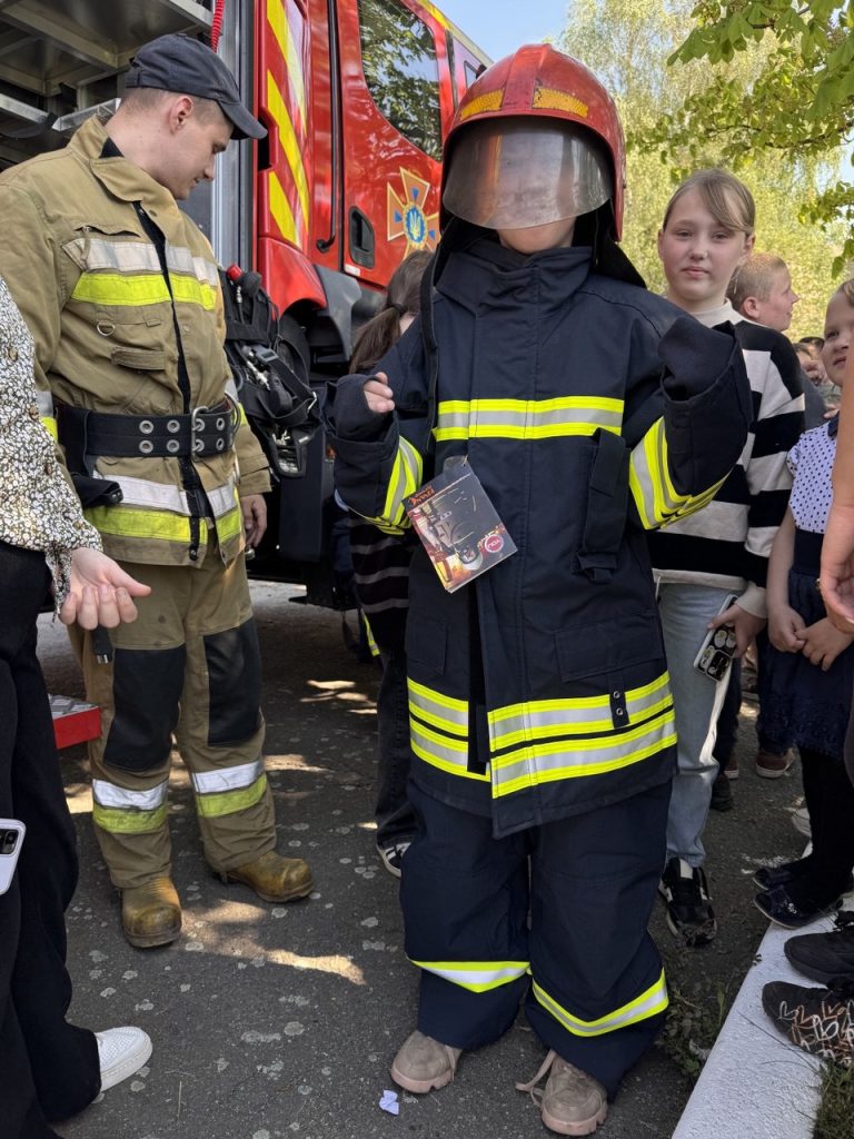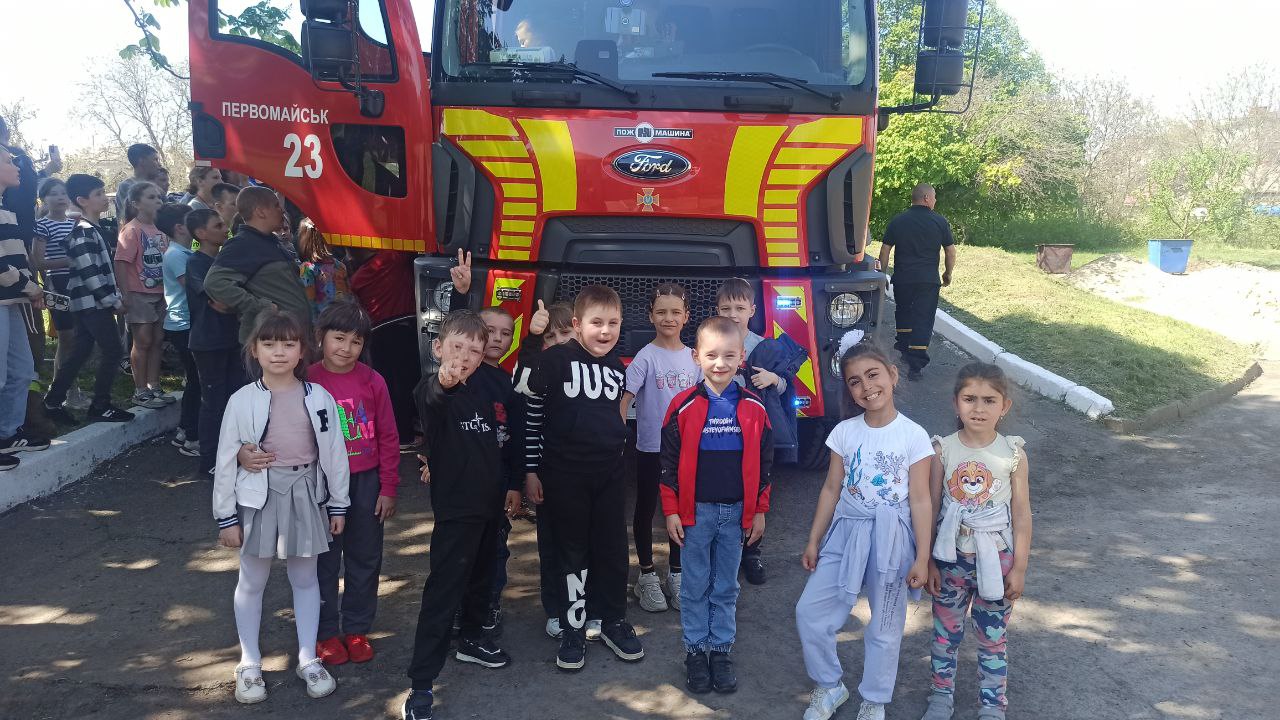 Відповідно до плану відбулася зустріч із працівниками територіального підрозділу ДСНС України в Миколаївській області. Начальник караула 23 ДПРЧ 5ДПРЗ ГУ ДСНС Ростислав Голембієвський під час зустрічі познайомив здобувачів освіти з облаштуванням пожежної машини, устаткуванням та дав змогу дітям спробувати самостійно одягти спорядження. Члени караулу продемонстрували високий рівень професіоналізму під час гасіння умовної пожежі, використовуючи воду та піноутворювачі.