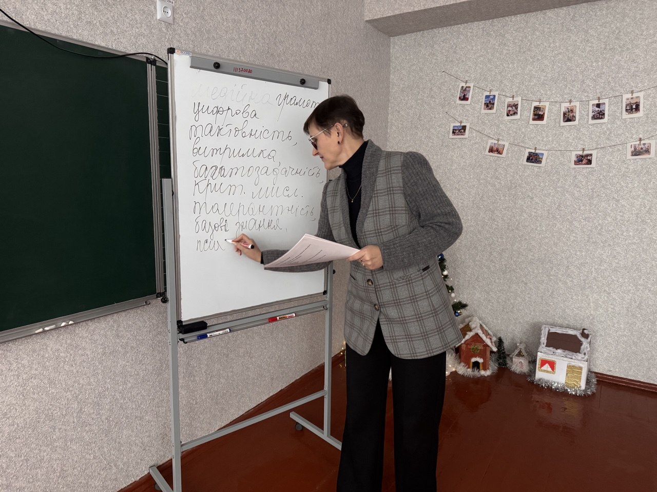 Під час зустрічі Олена Олександрівна ознайомила педагогів з актуальними нормативними документами та ключовими вимогами до проведення компетентнісного навчального заняття в умовах реалізації Нової української школи. Особливу увагу було приділено розумінню структури сучасного уроку та його спрямованості на формування життєвих компетентностей учнів.