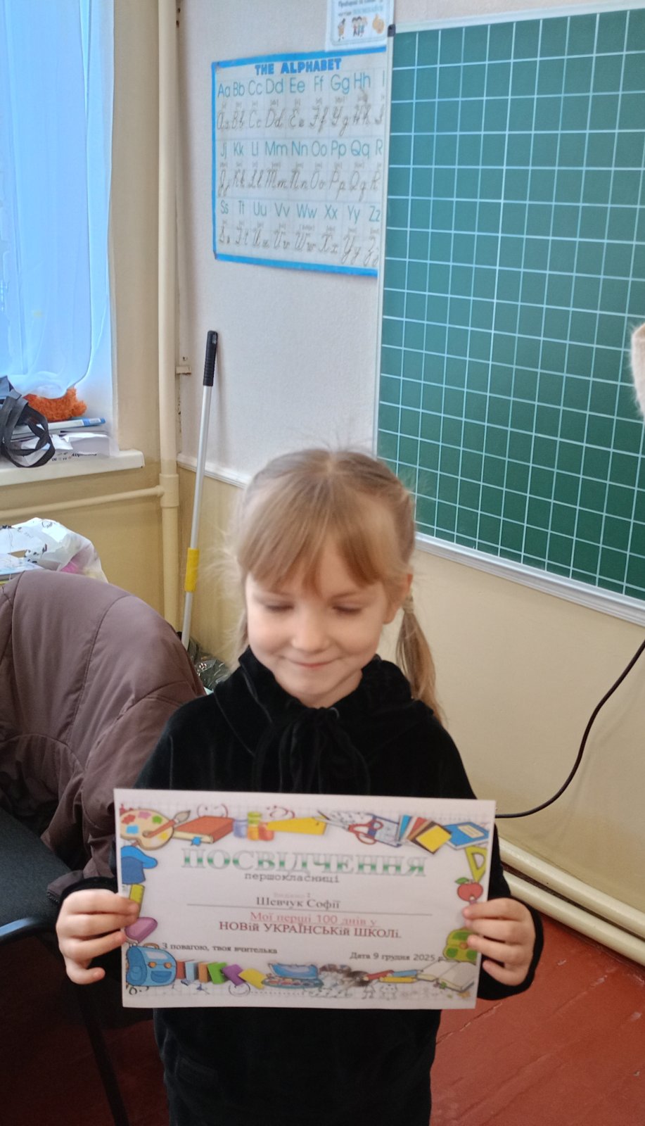 На завершення свята всі учні отримали не лише смачні солодкі подарунки, а й справжні, офіційні «Посвідчення про закінчення 100 днів у школі»! Це стало приємним символом першого важливого шкільного досягнення.