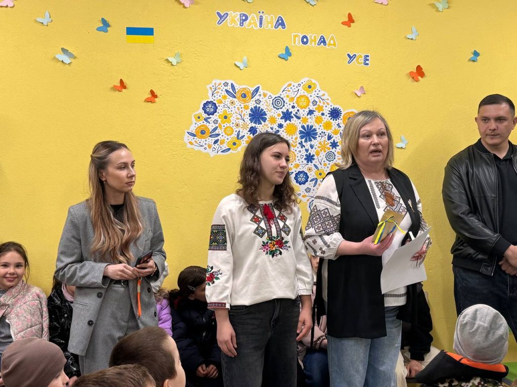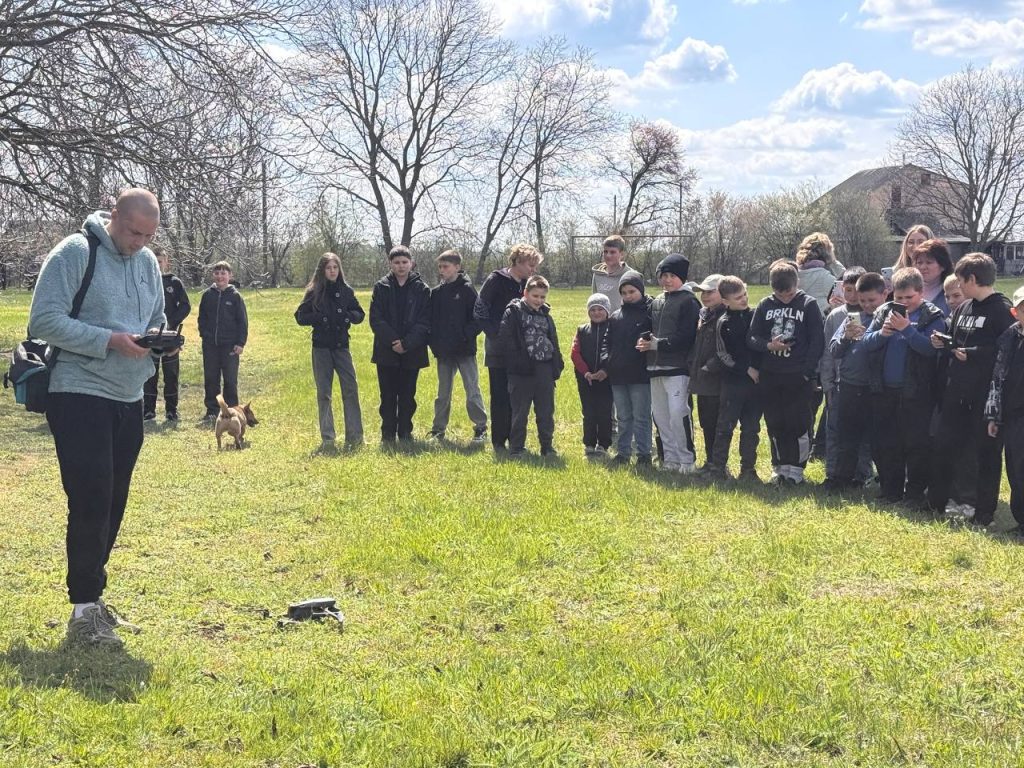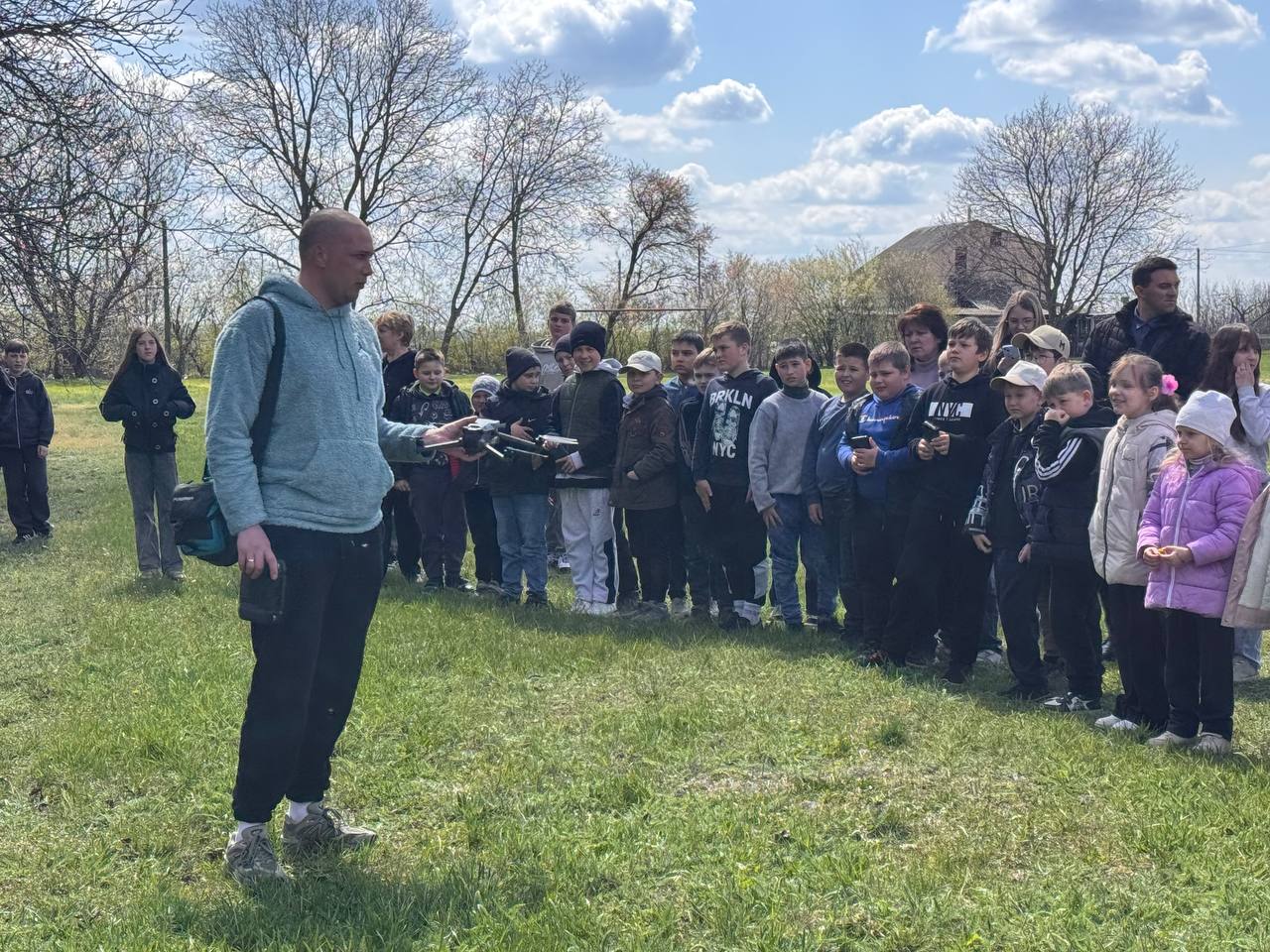 Після сигналу «Відбій повітряної тривоги» спілкування продовжилося на відкритому майданчику. Особливий інтерес викликала демонстрація сучасного безпілотного літального апарата: Максим Ольшевський розповів про його можливості та показав, як здійснюється управління дроном.